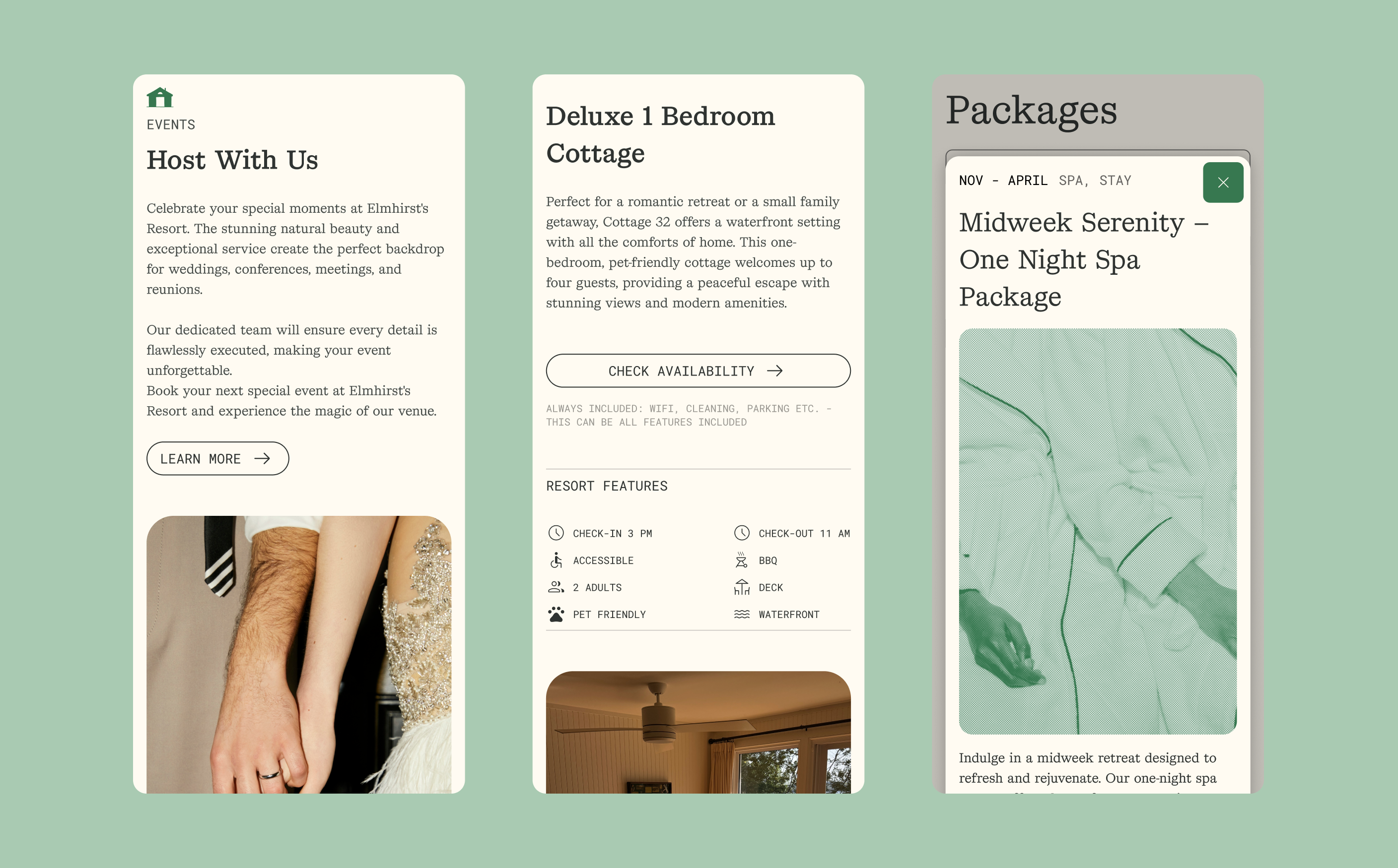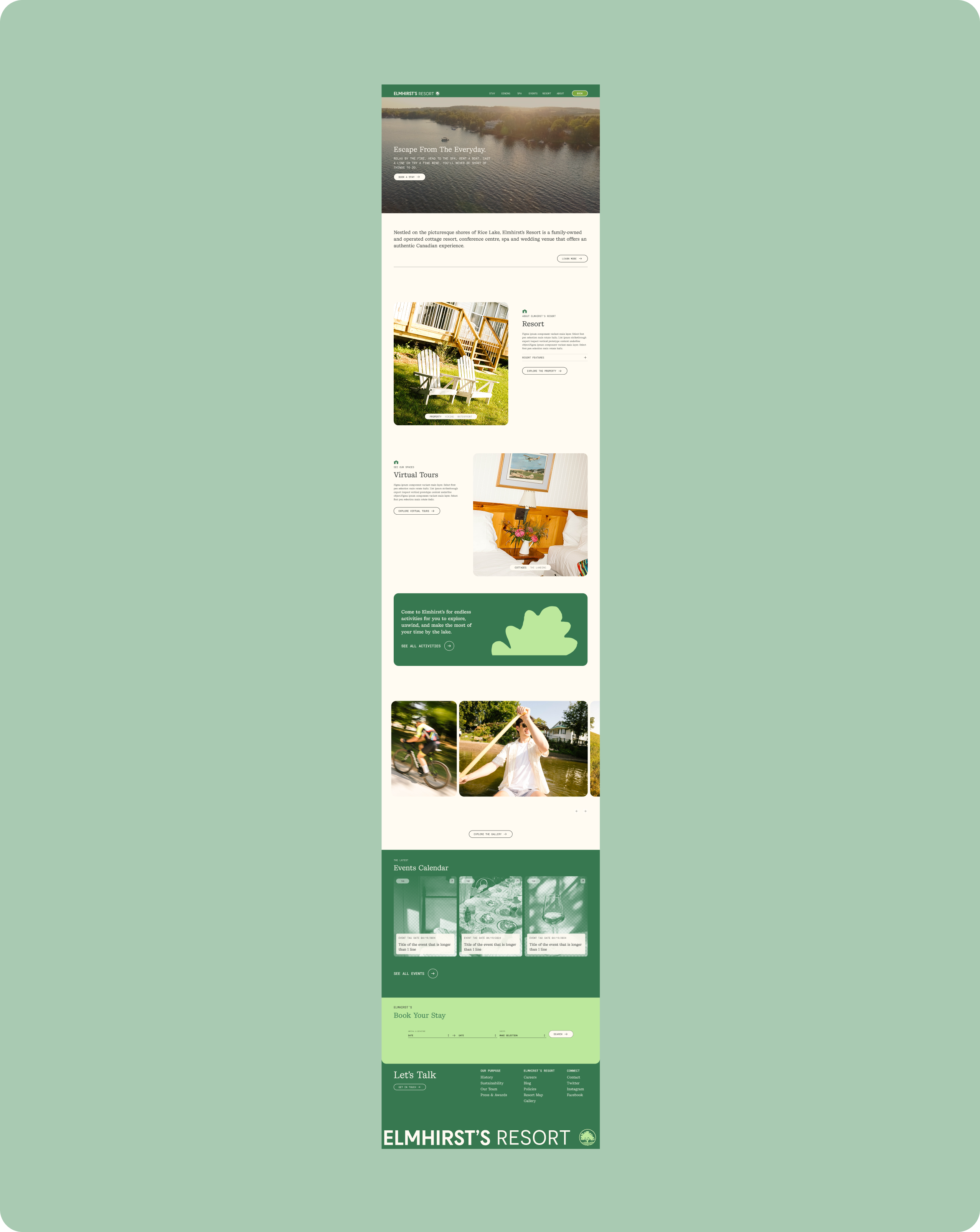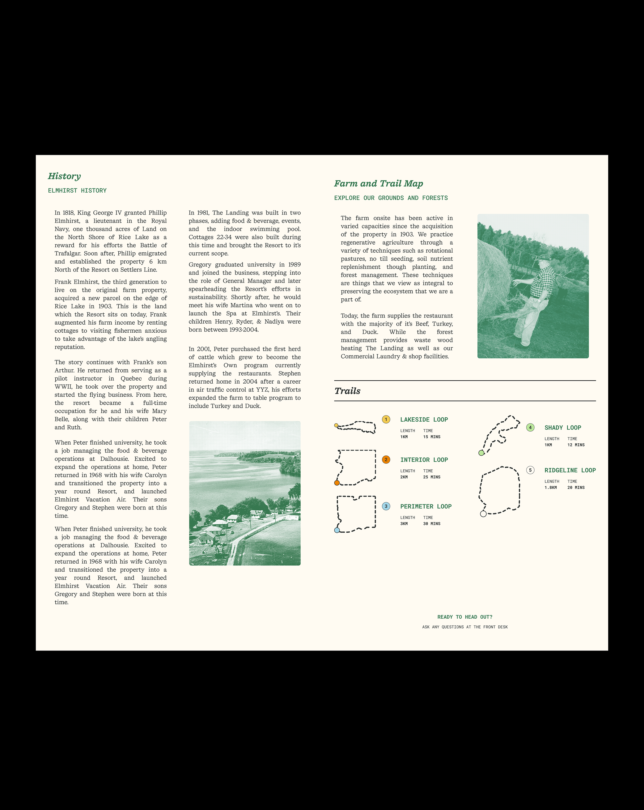 Henry Elmhirst had recently moved back home to his family’s 240 acre property off of Rice Lake with his fiancee Maggie ahead of the birth of their first child— Heath.In Henry assuming his role within his family’s generational business, he reached out in hopes to obtain support in giving Elmhirst’s assets and digital presence a refresh that sought to better reflect the on-site experience, driving the opportunity for guests new and old to relish in lifelong memories at the resort. Through archival pushes to bring their look back to its roots - alongside massive web audits to prioritize a seamless user experience - this effort began to take shape. Pushing the web presence further, we used components to develop out on-site experience guides, signage, and other assets (both digital and physical) to carry guests through their time at Elmhirst’s.